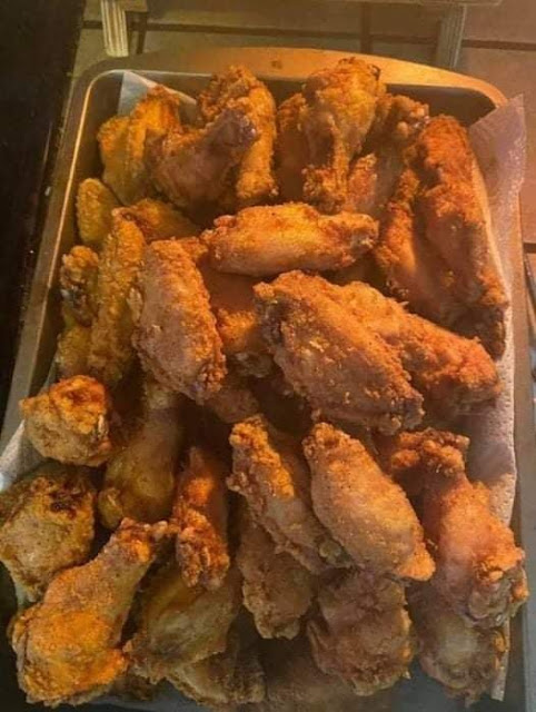 Her husband, Tony passed her a Beer and a plate with both Shrimps and Fried Chicken..